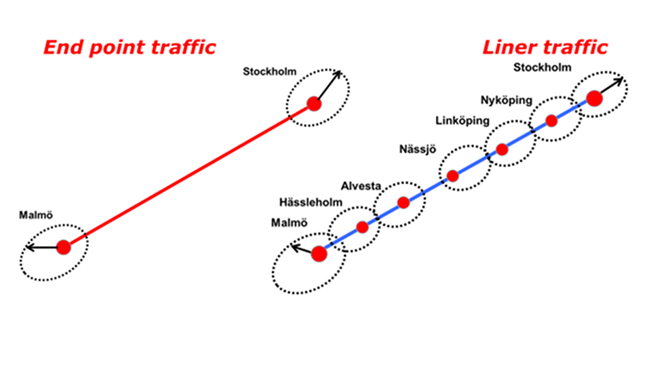 Flera mindre terminaler med avståndet mellan terminalerna på 15 mil vilket gör att det finns möjligheter att utföra distributionen med hjälp av elektriskt drivna distributionsfordon. Ett finmaskigt och effektivt transportnät som klarar av de högre ställda kraven på låg energiförbrukning och låga CO2 utsläpp. Miljökraven på en framtida struktur är uppfyllda. Det kommer givetvis att kräva en utbyggnad av det befintliga järnvägsnätet. Det finns egentligen inte någon annan möjlighet.