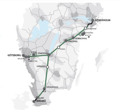 Kartan till nedan visar den planerade utbyggnaden av Sveriges höghastighetsbanor. Vi följer den så mycket det går i vår utbyggnad.