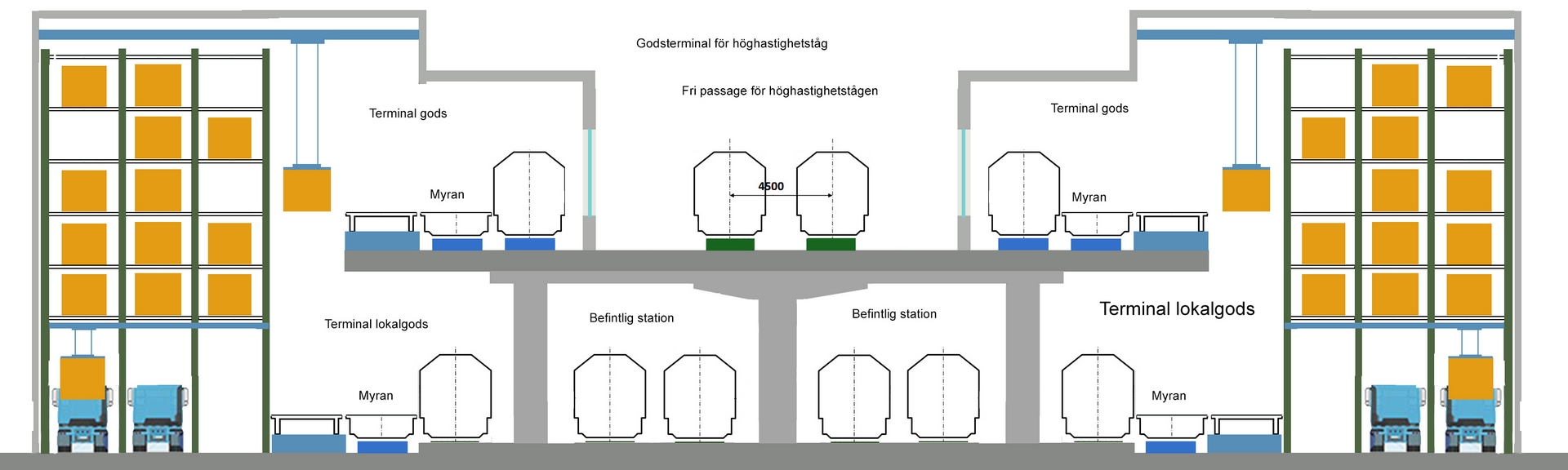 Det går att lösa med gemensamma utrymmen om man låter delar av tåget frakta gods och den andra delen passagerare. Med vår teknik att hantera containers så kliver en container av tåget på 2 minuter och det sker utan att en människa är involverad. Räknar man med 5 minuters stopp så hinner tekniken även lasta en container på den tiden. Det betyder att det blir helt andra kalkyler för att betala investeringarna för höghastighetstågen.